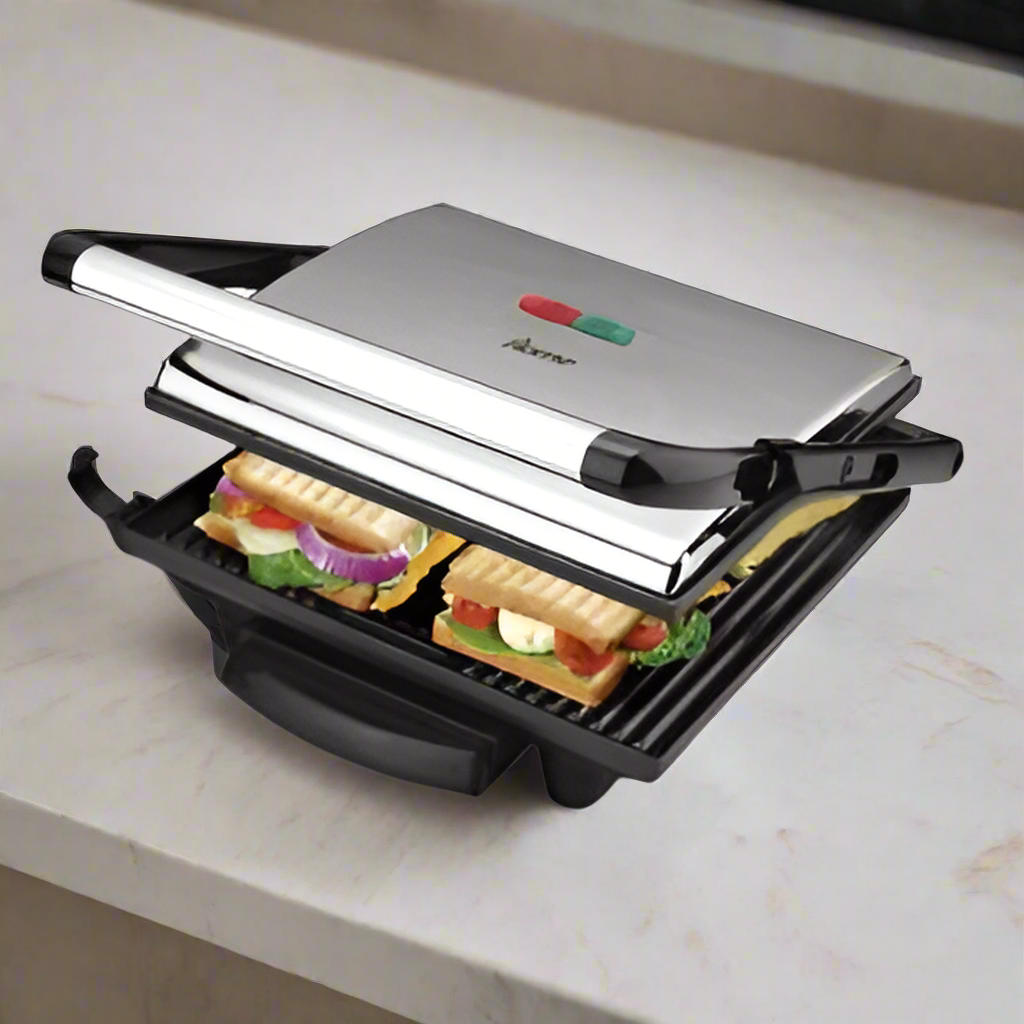 טוסטר לחיצה איכותי 2000W בגימור נירוסטה מוברש, בעל משטח צלייה עם פסים, רחב במיוחד. זה מאפשר הכנת מספר רב של טוסטים בו זמנית.