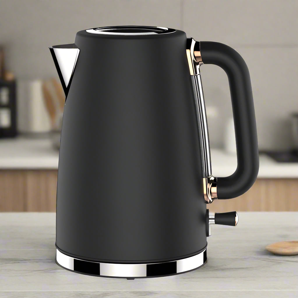 קומקום בעיצוב קלאסי בצבע שחור מט בשילוב זהב ונפח מים של 1.7 ליטר עם הספק של 1850–2200W.